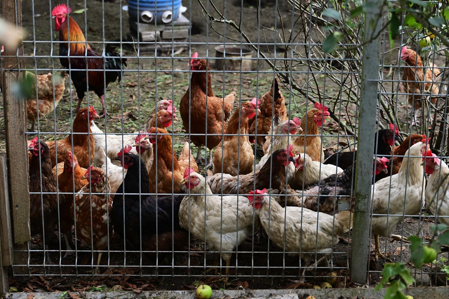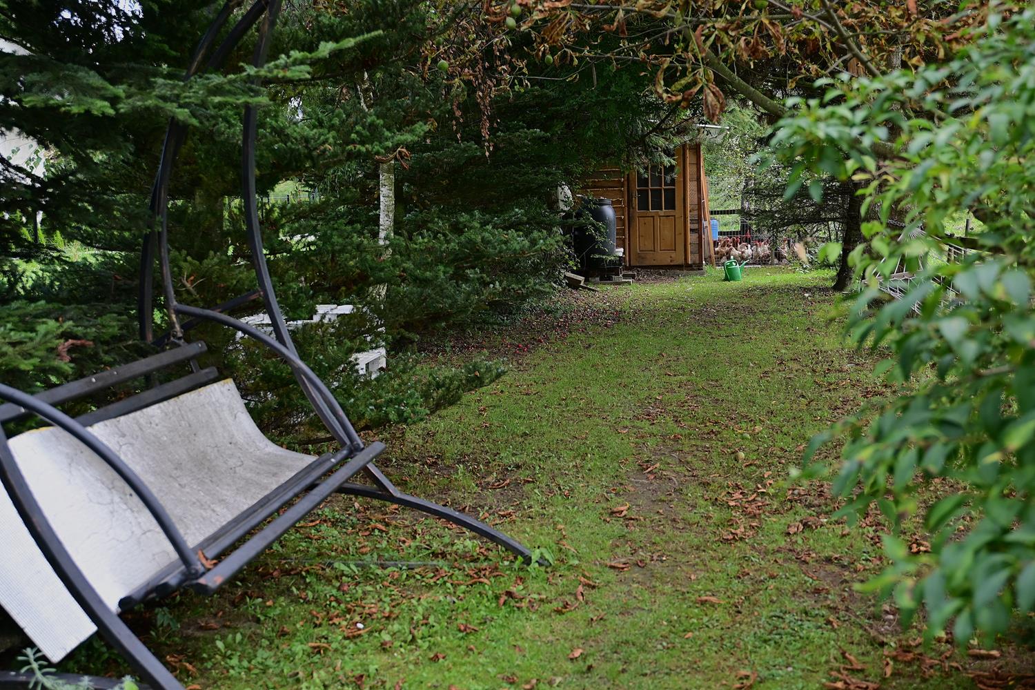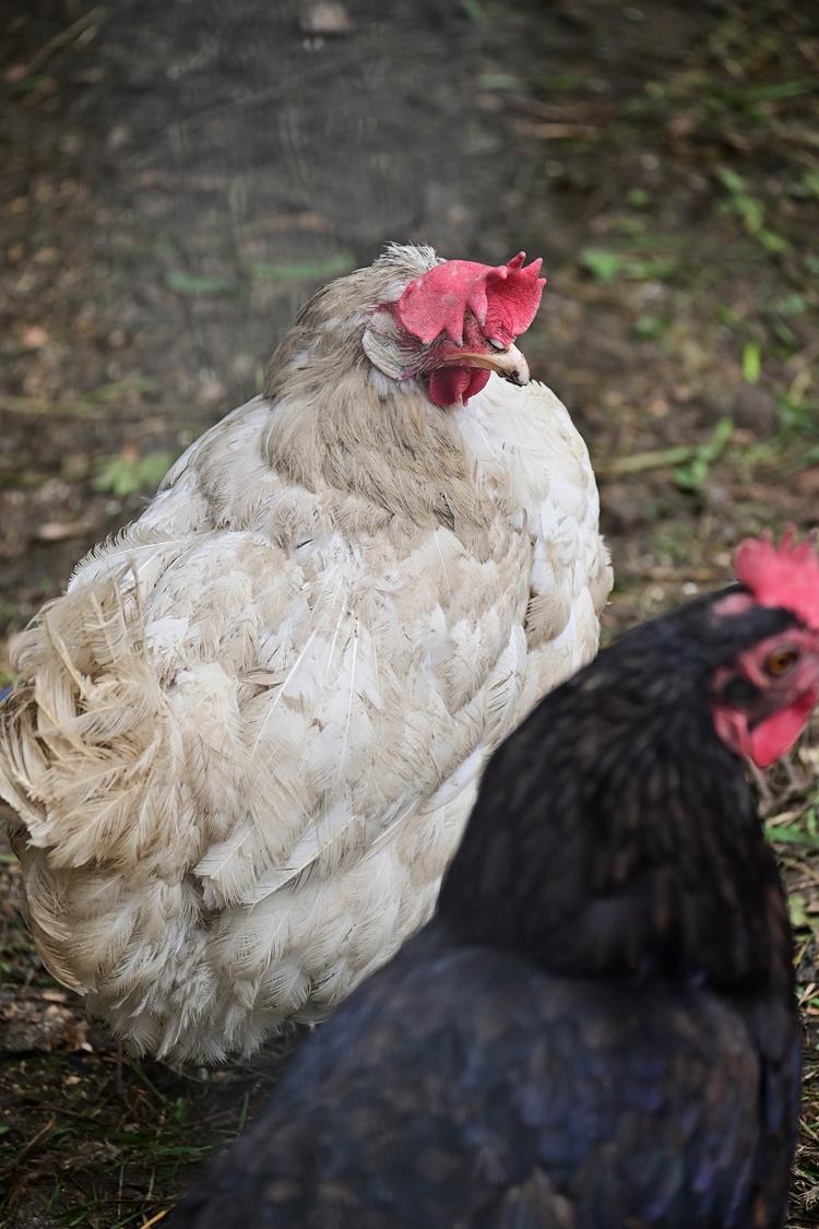Zachwycona tym dyniowym teatrem, ruszyłam dalej, w głąb ogrodu. Ciszę przerywało gdakanie – i wtedy zobaczyłam je: stadko uroczych, ciekawskich kur, które nic sobie nie robiły z mojej obecności. Podeszłam bliżej, a one – jakby mnie znały od lat – przywitały mnie z zaciekawieniem. Ich upierzenie mieniło się w słońcu: od klasycznej bieli, przez rudawe łaty, aż po prawie czarne pióra z zielonym połyskiem. Niektóre gdakały w kurniku, inne dziobały trawę, a jedna z kur łypała na mnie ciekawie.