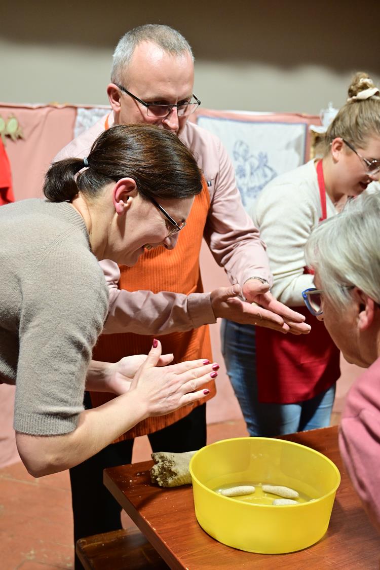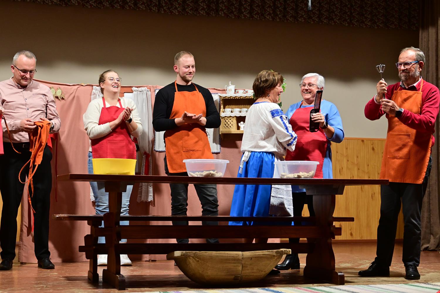 Nie zabrakło też konkursów z humorem, które szybko podbiły serca publiczności. Pierwszy z nich – dla par – polegał na sulaniu sulek dla gęsi. Oceniającą była niezawodna Babka z przedstawienia, która z dużym zaangażowaniem wskazywała zalety i mankamenty powstałych dzieł.