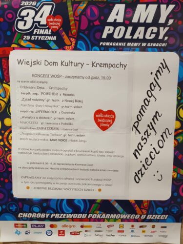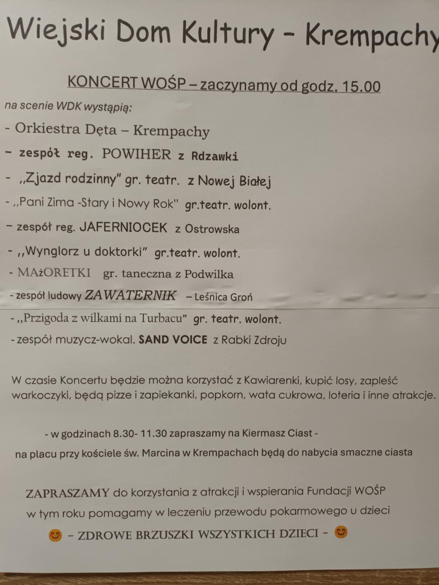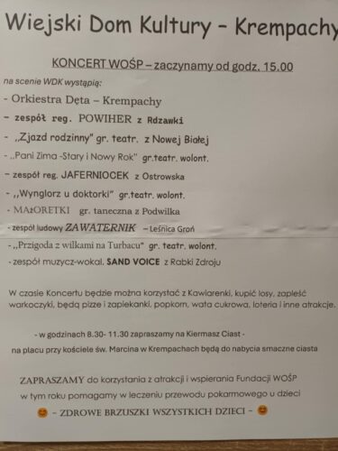 Już w niedzielę 25 stycznia od godz.15.00 zapraszamy na Koncert WOŚP do Wiejskiego Domu Kultury w Krempachach, a wcześniej po mszach św. na kiermasz ciast.