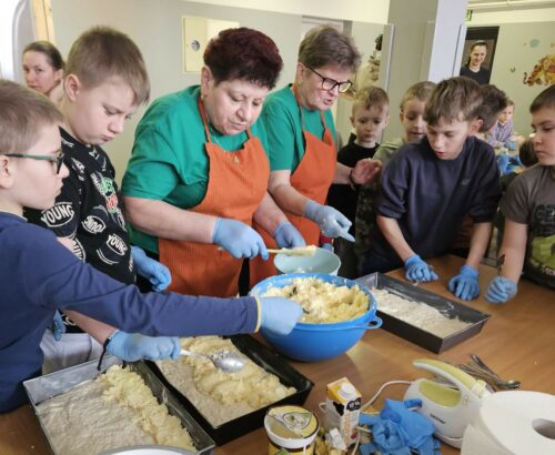 Zajęcia spotkały się z bardzo dużym zainteresowaniem społeczności szkolnej. Uczestniczyli w nich uczniowie oddziału przedszkolnego wraz z rodzicami oraz uczniowie klas I–VII. Warsztaty były doskonałą okazją do poznania regionalnego dziedzictwa kulinarnego oraz do aktywnego, wspólnego spędzenia czasu w miłej i twórczej atmosferze. Podczas spotkania dzieci miały możliwość samodzielnego przygotowania tradycyjnych potraw regionalnych, takich jak grulownik, gałuski oraz moskole, a następnie ich degustacji. Uczniowie z dużym zaangażowaniem uczestniczyli w zajęciach, poznając nie tylko receptury, ale także historię i znaczenie tych potraw w lokalnej tradycji.