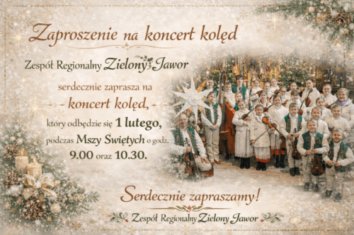 Zespół Regionalny Zielony Jawor serdecznie zaprasza wszystkich Parafian oraz Gości na koncert kolęd, który odbędzie się w niedzielę 1 lutego, podczas Mszy św. o godz. 9.00 oraz 10.30.