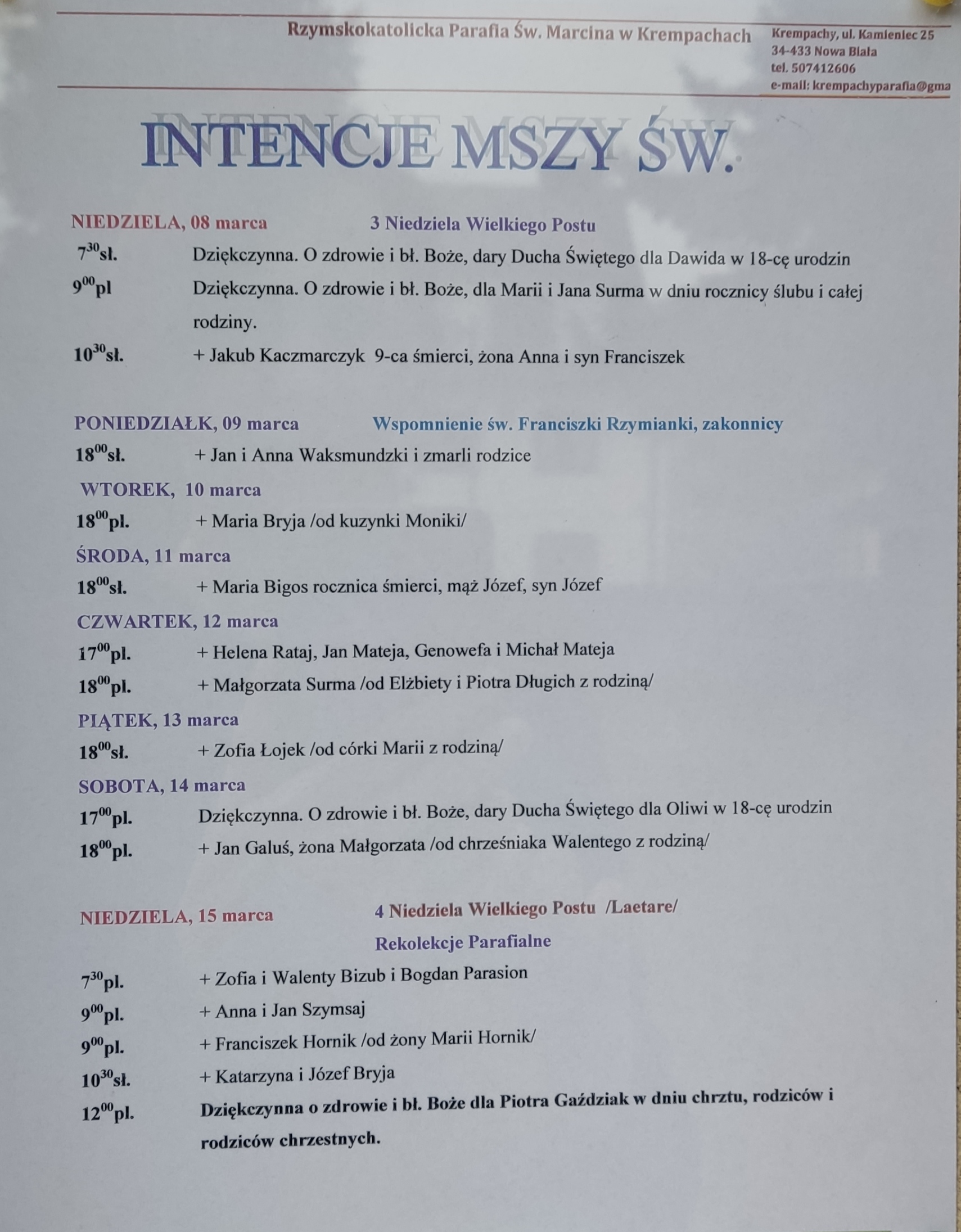 Rada Parafialna przy Parafii św. Marcina w Krempachach uprzejmie informuje, że w przyszłą niedzielę tj. 12.03.2023 r. będzie zbierana składka od rodzin na potrzeby naszej wspólnoty parafialnej za I kwartał 2023 r. Wspomnianą składkę prosimy […]