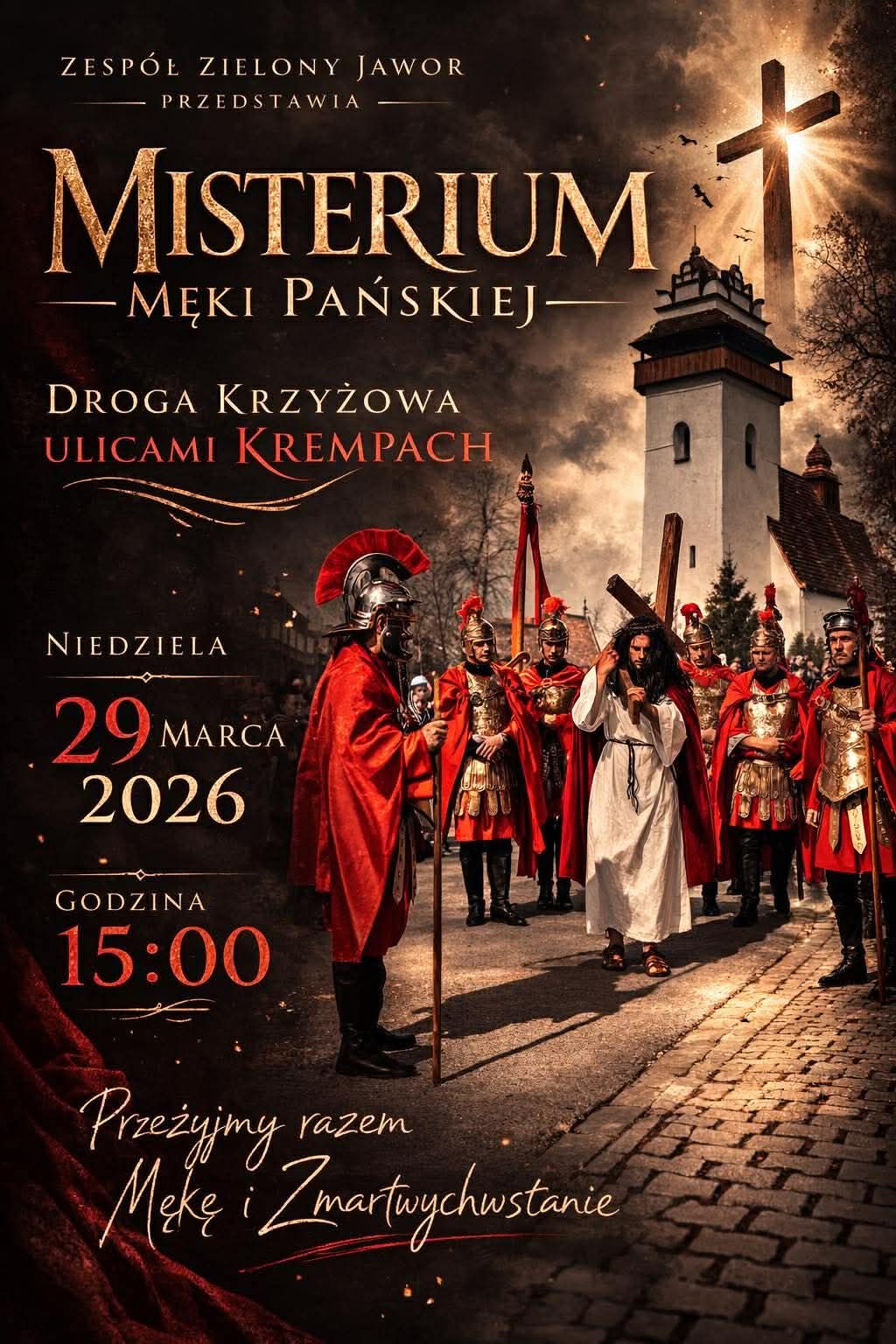 Zapraszamy mieszkańców do udziału w Misterium Męki Pańskiej, które odbędzie się w niedzielę 29 marca. Wydarzenie przygotował Zespół Zielony Jawor, który poprzez muzykę i słowo wprowadzi uczestników w atmosferę refleksji nad tajemnicą Męki Pańskiej.