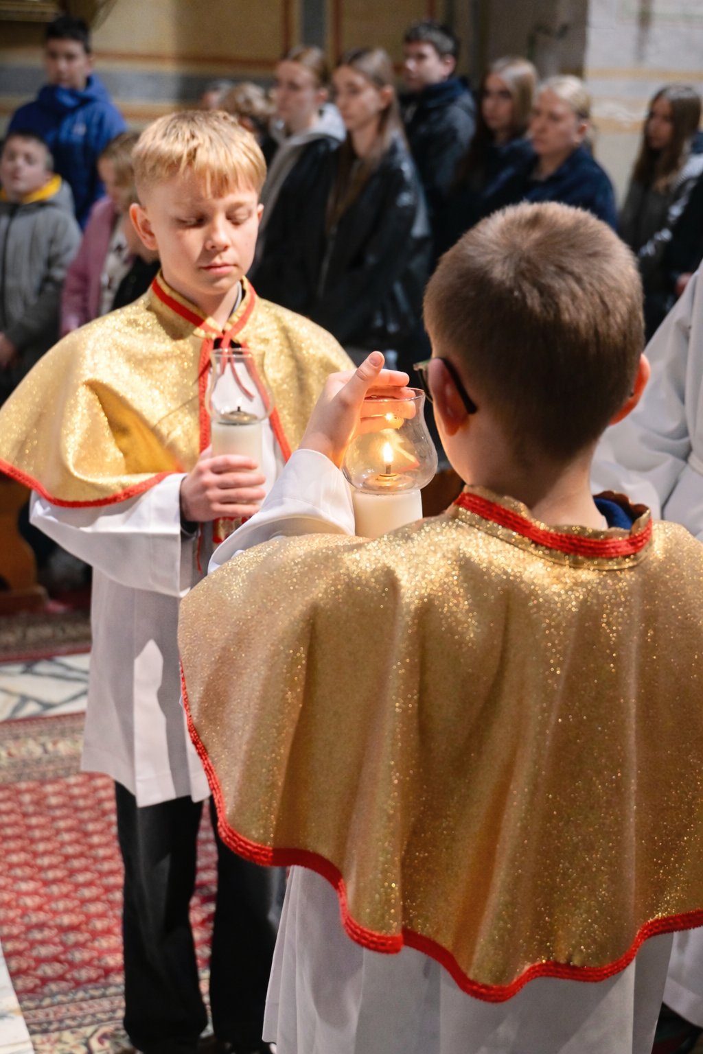 Obchody rozpoczęliśmy się w Wielki Czwartek wieczorem Mszą Wieczerzy Pańskiej, upamiętniającą Ostatnią Wieczerzę, podczas której Jezus ustanowił Eucharystię oraz kapłaństwo. W tym dniu w sposób szczególny dziękowaliśmy Panu Jezusowi za Jego Ciało i Krew i za sprawujących Najświętszą Ofiarę kapłanów. Po gromkim „Chwała na wysokości” nastąpiło tradycyjne, symboliczne zawiązanie dzwonów. I my podziękowaliśmy ks. proboszczowi za jego trud i posługę w naszej parafii skromną wiązanką kwiatów i życzeniami. Po zakończeniu tej Mszy św. ks. proboszcz przeniósł Najświętszy Sakrament do ciemnicy. Tam do późnych godzin wieczornych adorowaliśmy Pana Jezusa i trwali wraz z Nim w oczekiwaniu na Jego mękę i śmierć…